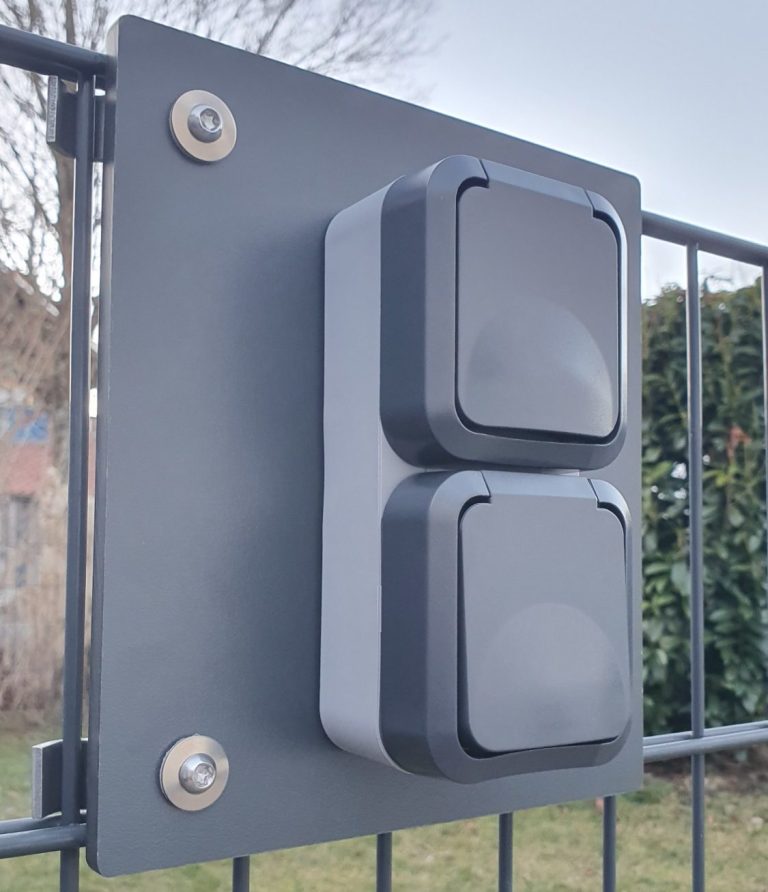 Sie möchten eine Außensteckdose an Ihrem Doppelstabmattenzaun montieren, wissen aber nicht wie?